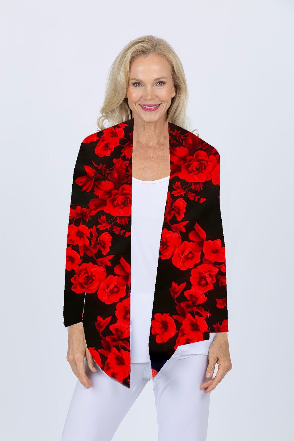 The soft lightweight jacket offers a drape front collar which sits nicely over the bust finishing at waist height. The shorter style allows you to team back with different outfits without it feeling too bulky through the body.