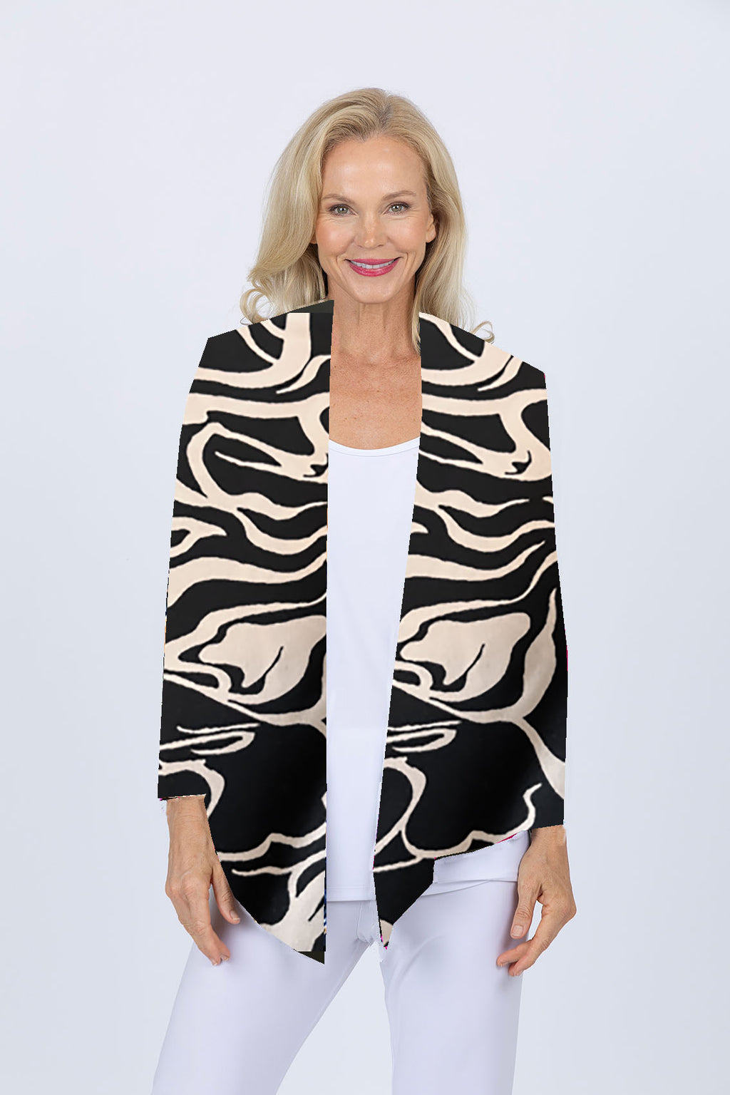 The soft lightweight jacket offers a drape front collar which sits nicely over the bust finishing at waist height. The shorter style allows you to team back with different outfits without it feeling too bulky through the body.