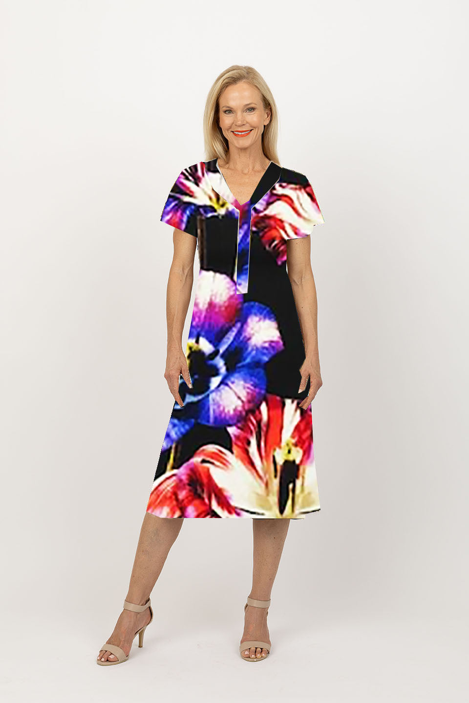 Sits just past the knee with A line cut and straight flowing hem line. Features a small bell sleeve for a more flattering sleeve length. Crafted from premium stretch jersey fabrication, offering a loose fit on the body that still provides shape and is flattering for all body shapes and bust sizes. Gives you shape through the top with an A line skirt which covers the bottom and hip areas.