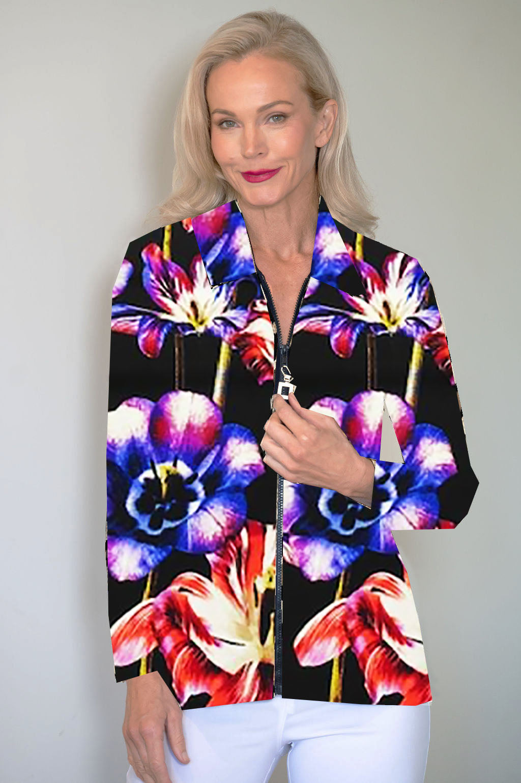 The zip Cardi is a comfortable loose fit which is figure flattering & is suitable for all body shapes.