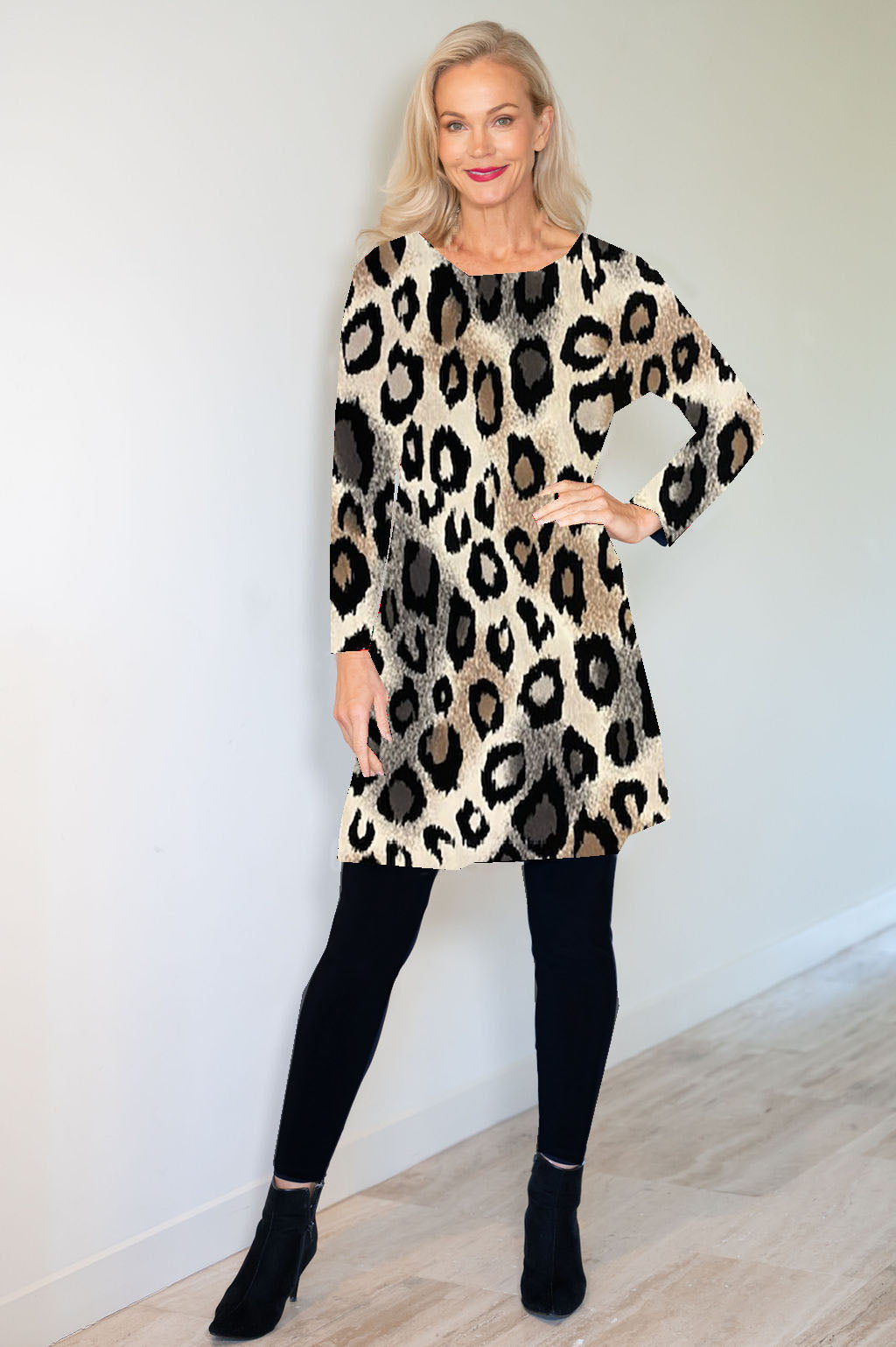 Made from our premium stretch fabric, this gives great coverage for hips and bum area. Slim fit through the bust, with a A-line cut through the body. Short sleeve for arm coverage. Hem sitting just off the hip and bottom.